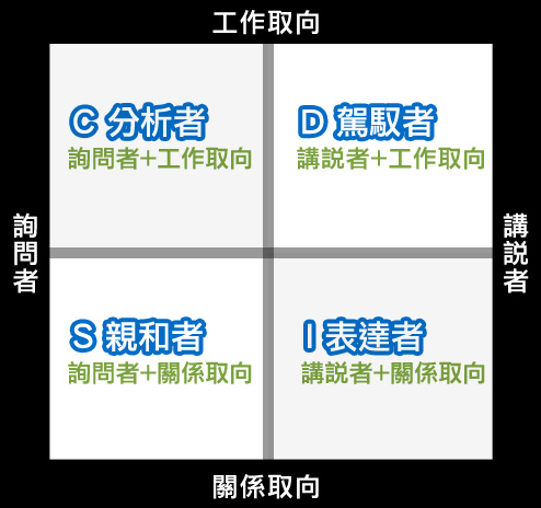 因此風格類型不是萬年標籤,是會隨著外在環境改變的喔!譬如原本不容易果斷做決定的S親和型,擔任幹部或領導、接受訓練後,很可能發展出D駕馭型的衝勁和果決;原本重視工作甚於人際、比較嚴肅不喜歡開玩笑的C分析型人,在一個有安全感、重視人與人之間關係的環境中待了一陣子,也會漸漸受到影響,他的S(親和型)特質會增加,慢慢能夠放鬆、變得比較容易信任人。